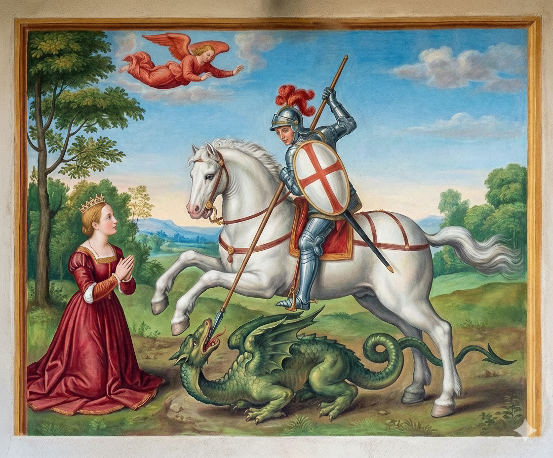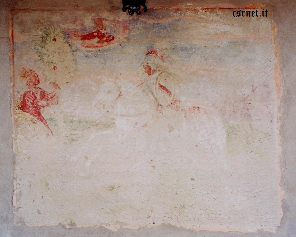 Ciò che rimane dell’affresco raffigurante S. Giorgio che sconfigge il drago con una possibile ricostruzione digitale. L’affresco si trova all’esterno sopra la porta di ingresso.