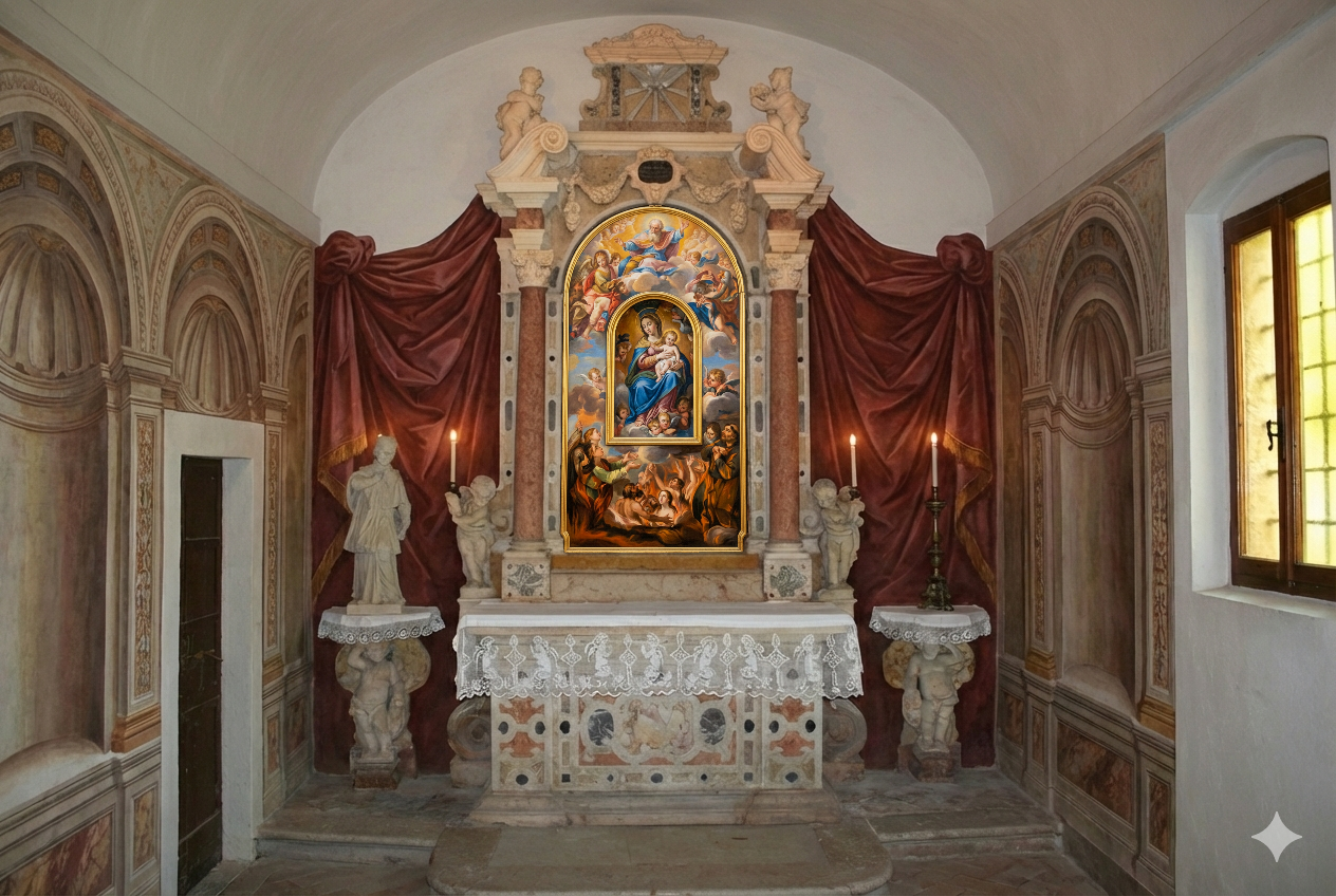Ricorrendo all’intelligenza artificiale proponiamo una possibile ricostruzione dell’interno dell’oratorio riportando all’anno della sua edificazione.
