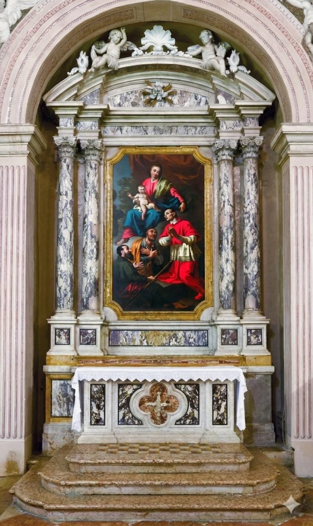S. Carlo Borromeo, sovrastato dalla Vergine col Bambino e, in posizione subordinata, S. Giacomo Minore e Filippo.