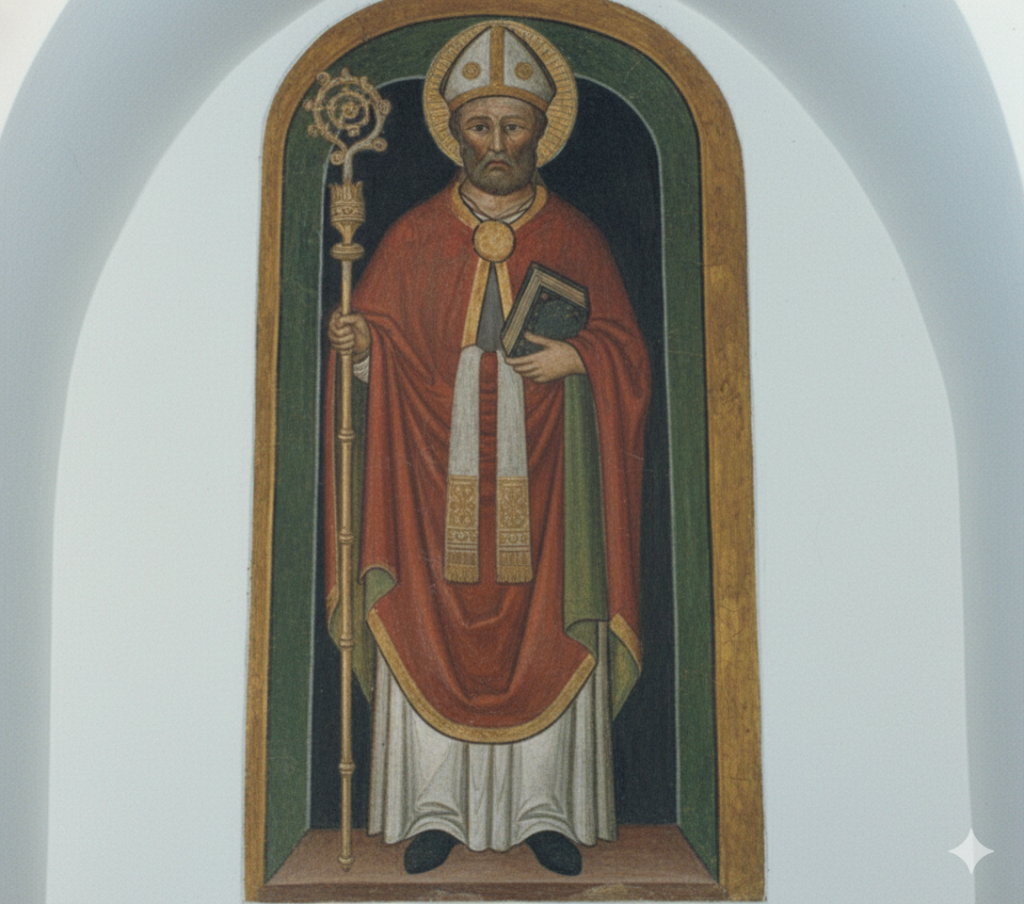 All’interno di una sala del Monte di Pietà vi è un frammento di un affresco, databile tra il XV e il XVI secolo) che raffigura un Santo Vescovo. Sebbene manchino iscrizioni leggibili, gli attributi iconografici sono classici. Indossa un piviale rosso (colore che può simboleggiare il martirio o la carità) chiuso sul petto da un vistoso fermaglio circolare dorato. Sotto si intravede la tunica scura. Porta la mitra, copricapo alto e decorato, tipico della dignità episcopale. Impugna il pastorale, visibile sulla sinistra c’è l’asta dorata terminante con un ricciolo (qui parzialmente mutilo). Sulla destra tiene il libro che rappresenta il Vangelo o la dottrina della Chiesa.