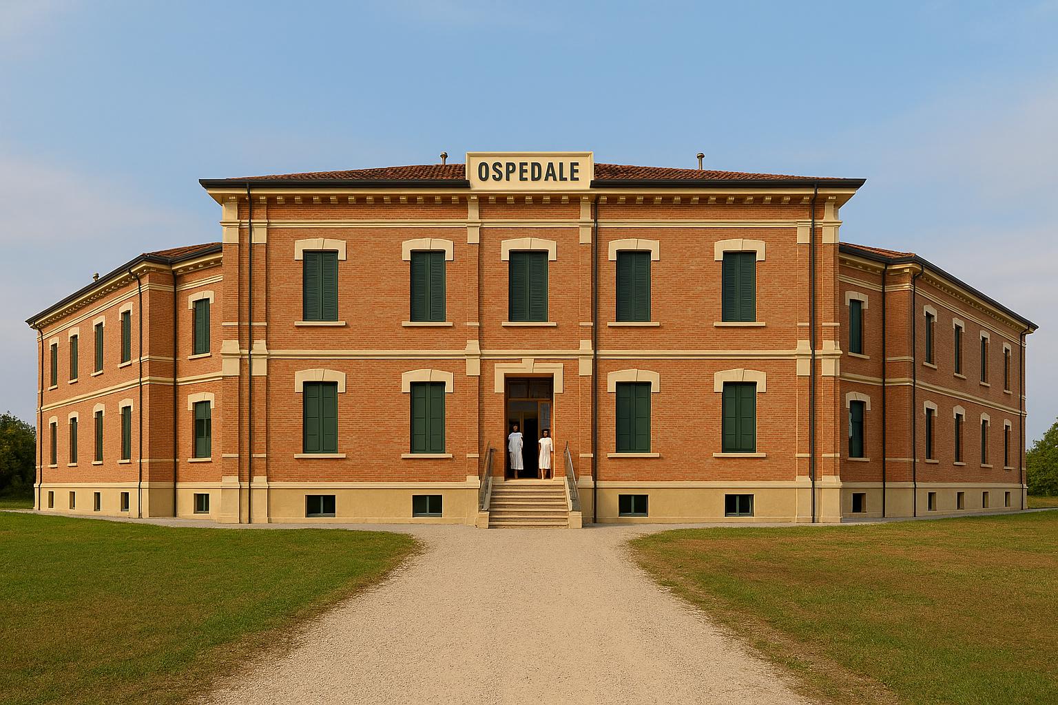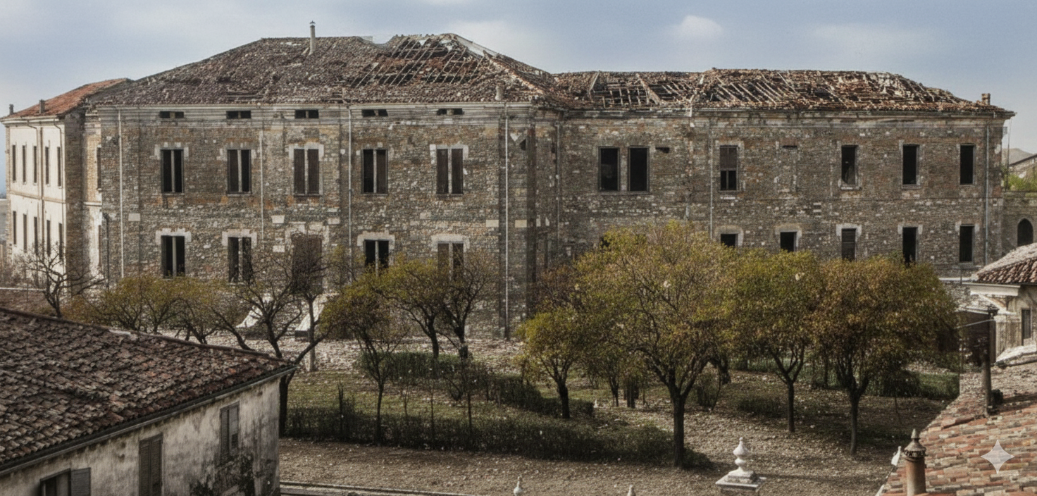 La foto ritrae l’ospedale dopo il bombardamento su Isola della Scala del 28 gennaio 19446; la ricostruzione digitale è stata generata con l’ausilio di Intelligenza Artificiale.
