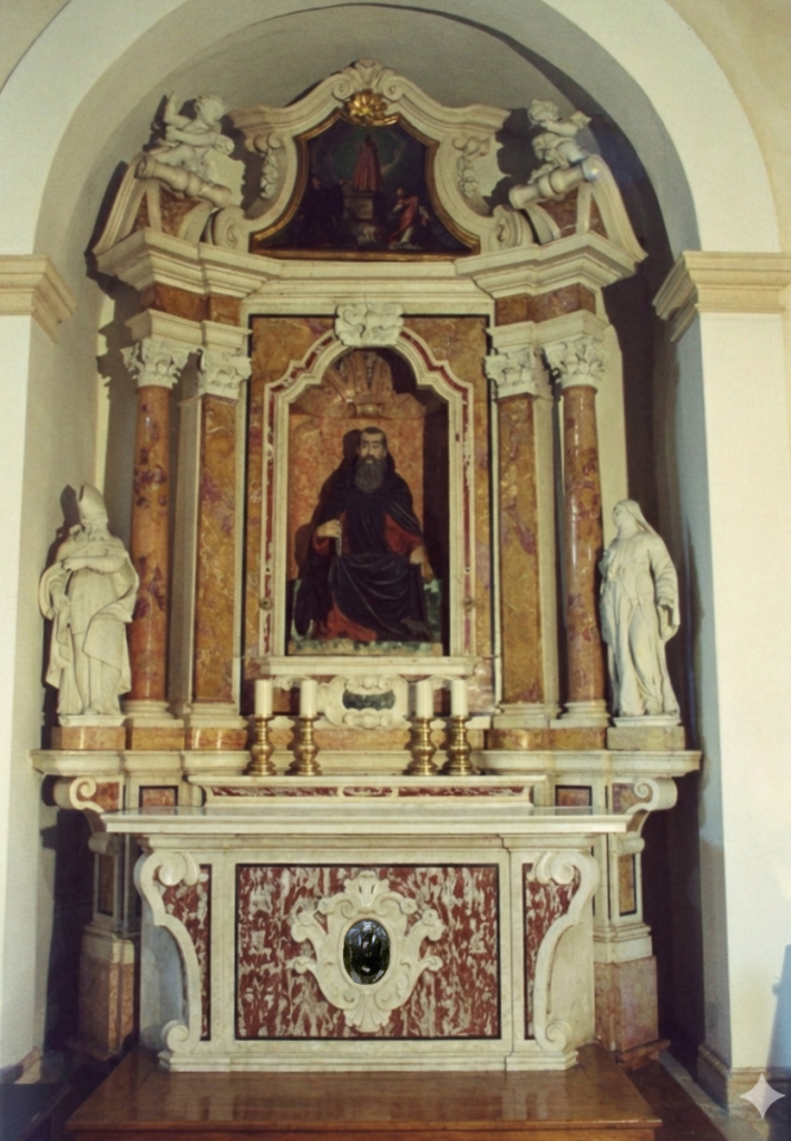 Il paliotto originale dell’altare di S. Antonio venne asportato nel 1954 per essere inserito nella chiesa della Doltra (foto di sinistra). Negli anni ’90 quando l’oratorio venne restaurato, trovandosi l’altare privato del suo paliotto, se ne realizzò appositamente uno il più possibile somigliante a quello originale.