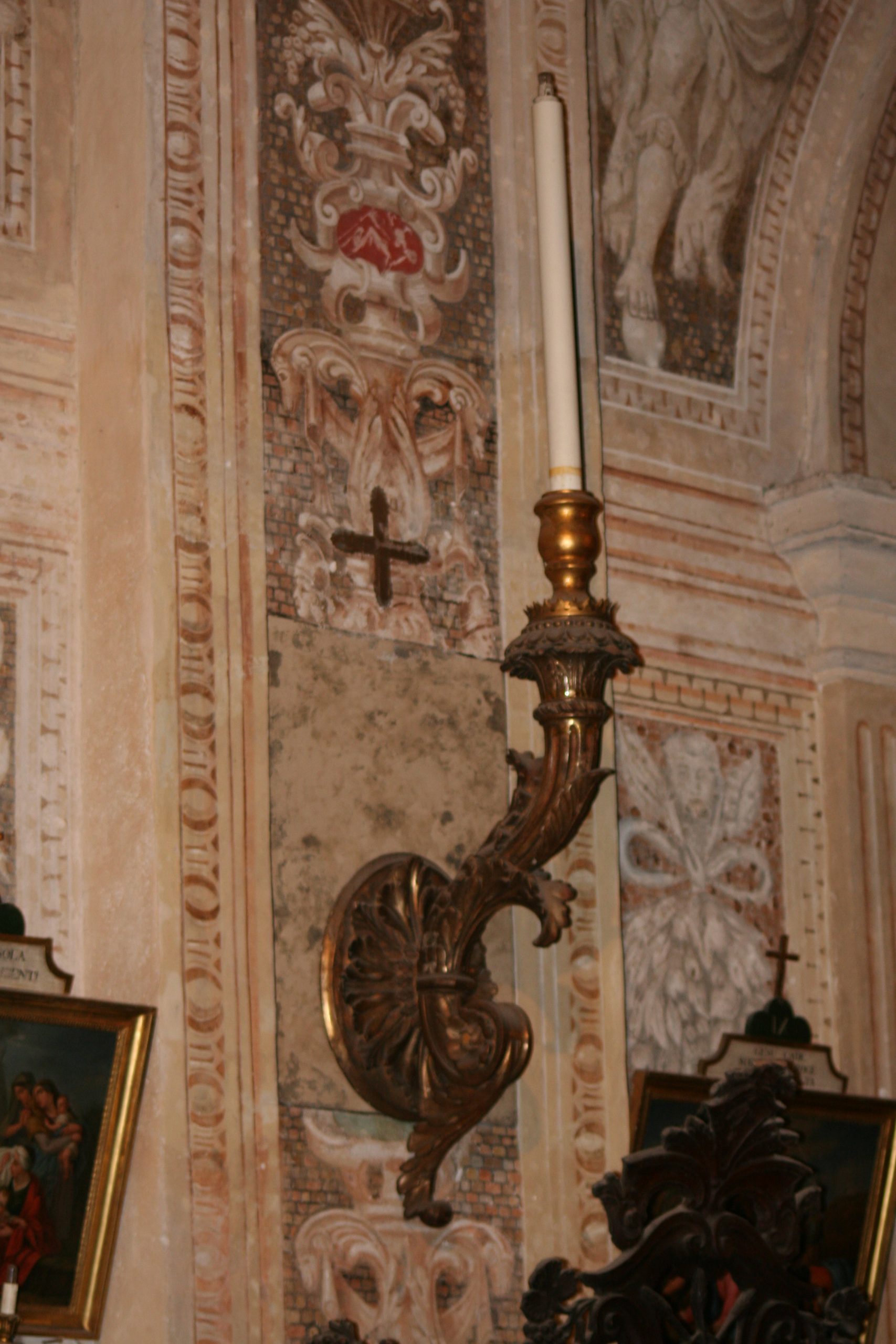 Quando venne restaurato l’altare di fronte, quello della Madonna in trono, togliendo la tinta bianca si scoprì l’originale disegno; si decise allora di riprodurre lo stesso disegno anche su questo arcone ritenendo che fossero uguali.