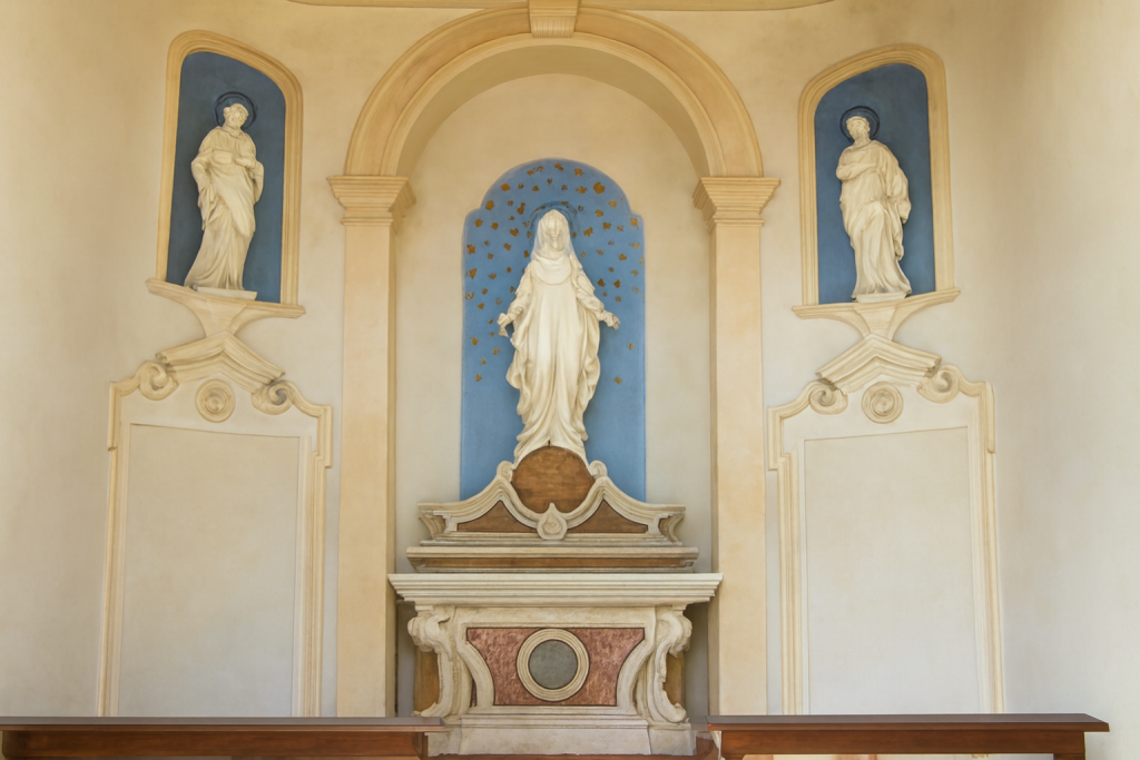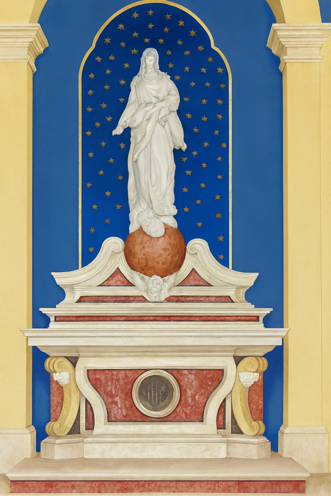 Altare marmoreo con statua dell’Immacolata Concezione. Ai lati, dentro nicchie, le statue di due santi.