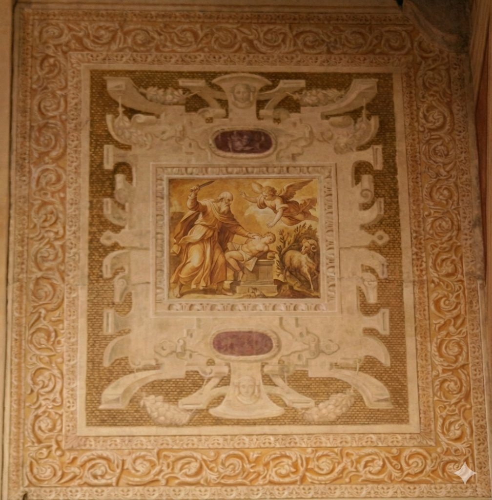 A sinistra il riquadro, perlopiù andato perduto, della rappresentazione di Dio che chiede ad Abramo di sacrificare Isacco. A destra una possibile ricostruzione digitale.