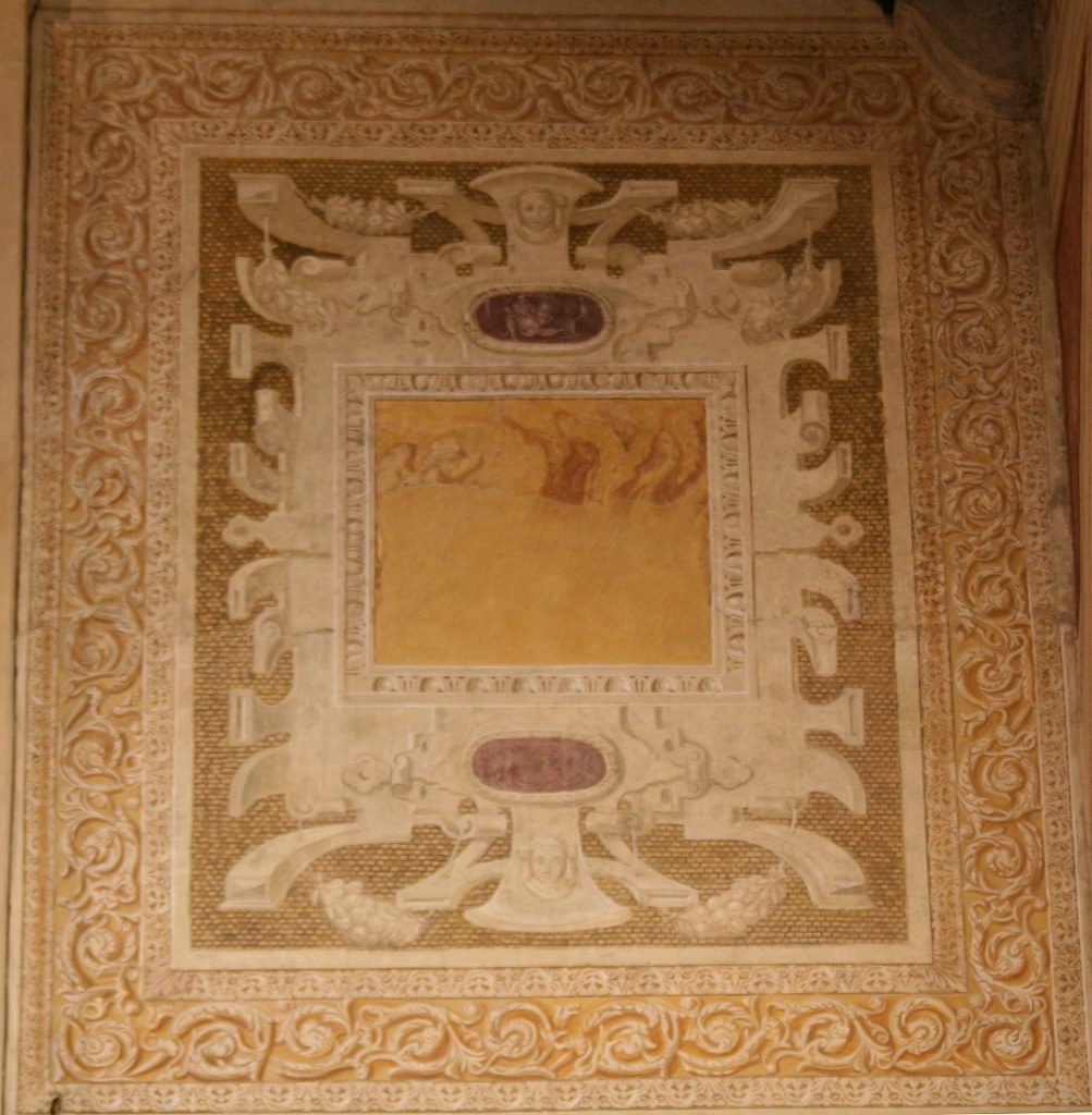 Come si presentava l’affresco; si notino tutte le picchettature che preparavano la parete ad un nuovo strato di malta su cui realizzare nuovi affreschi.